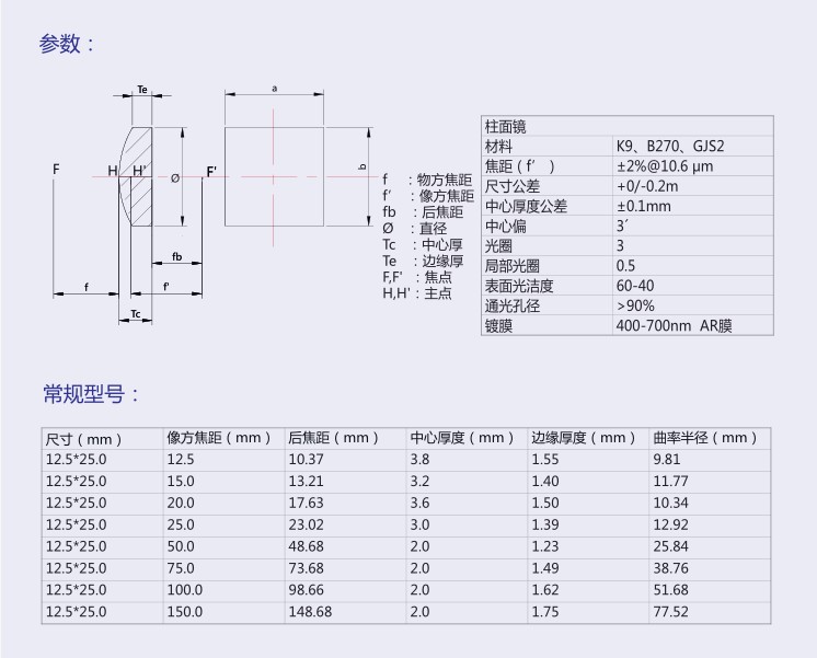可以有效減小球差和色差。分為平凸柱面透鏡、平凹柱面透鏡、雙凸柱面透鏡和雙凹柱面透鏡。具有一維放大功能。
